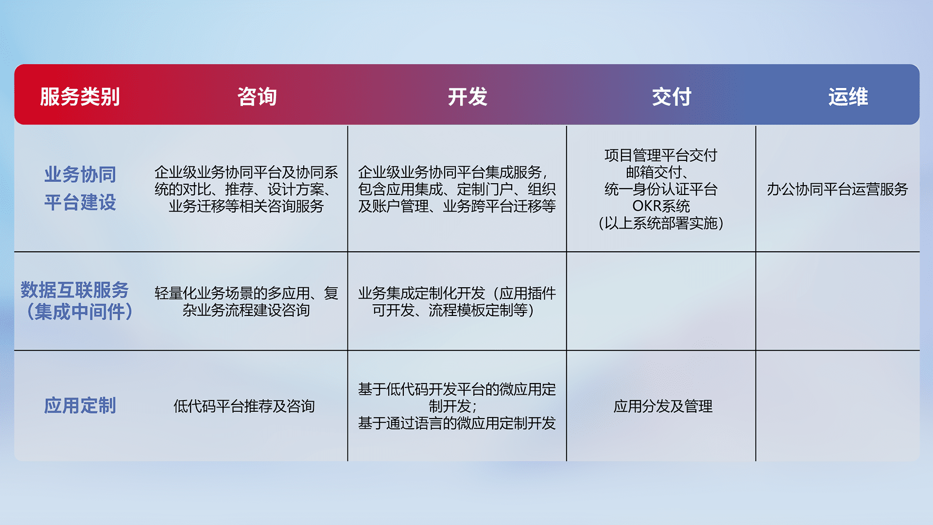 针对钉钉、、、企微、、IDaas等平台级产品提供产品的规划、、方案、、、交付、、、、定制化开发等服务,,,实现如统一协同办公、、、智能客户服务、、、混合会议管理、、、智能数据查询、、等业务场景,,,,实现数字化转型。。。