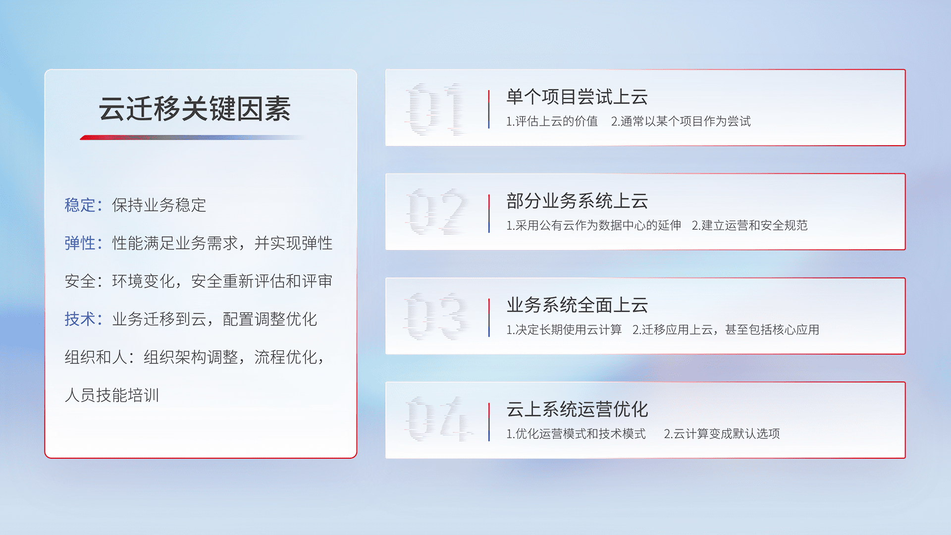 结合实际业务,,,从规划设计、、、、云平台选型、、、云原生改造、、、、数据迁移、、、、集成交付,,,,迁移全过程为客户识别最佳上云路径,,做好风险识别管理,,,设计网络架构、、、、身份权限、、、安全审计合规、、操作审计、、、日志审计、、监控告警策略、、、、多站点容灾设计等,,,对云上基础设施进行整体规划,,,,提升IT治理水平,,以满足弹性、、高可用、、高性能的需求。。